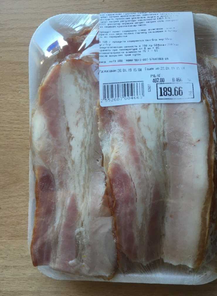 Чем больше срок годности продукта, тем больше химии использовалось при его приготовлении, но не все так страшно, при консервации бекона используют аскорбиновую кислоту, которая не несет большого вреда, но, что плохо, пользы она нам в данном случае также не принесет.