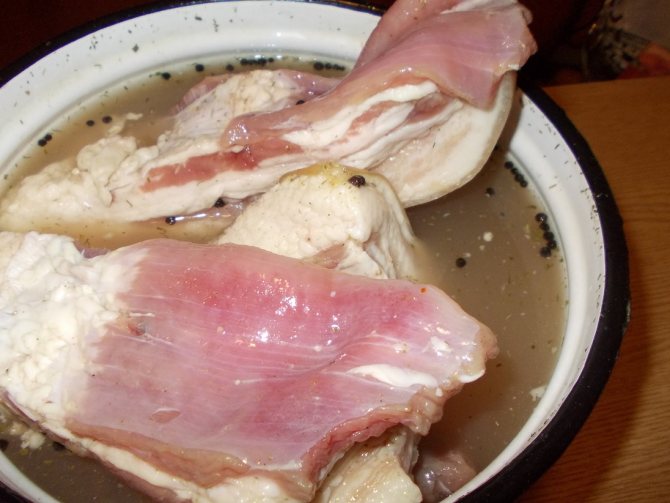 - Остудить рассол, нарезать грудинку как на отбивные. Промыть мясо, опустить в кастрюлю с рассолом.