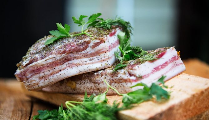 Остывшие куски можно сразу подавать к столу. Для хранения необходимо обмазать сало смесью соли, трав и молотого черного перца, завернуть в пищевую пленку.