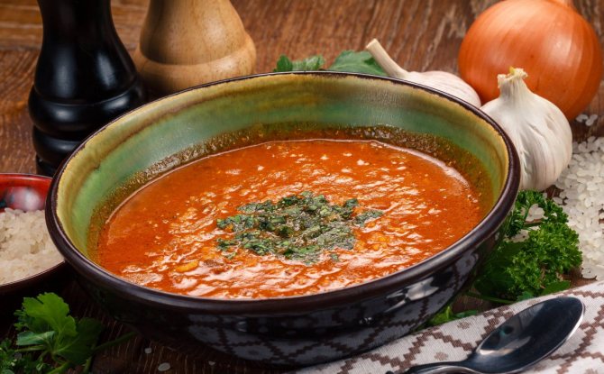Десяти минут вполне достаточно, чтобы спелые помидоры, нарезанные кубиком, размягчились – добавим измельченный чеснок, мелко нарезанные огурчики, томатную пасту (посмотрите, быть может нужно добавить больше чем указано в рецепте), кориандр, хмели-сунели, острый молотый перец, крупную соль. Все хорошенько перемешаем. Вольем бульон, процеженный после варки мяса. Не добавляйте слишком много бульона. Остри не суп! Если вы хотите действительно «остри», смело отправляйте несколько целых стручков острого перца. |