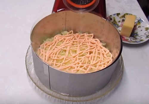 Чтобы удобнее было работать с соусом, переложите его в пакет, проделав дырочку снизу, или воспользуйтесь кондитерским шприцем. Сделайте это, поскольку, если просто смазывать слои ложкой, потеряется воздушность салата.