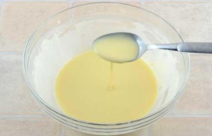 - Теперь соединим две яичных смеси, вольем молочный напиток и будем взбивать три минуты.