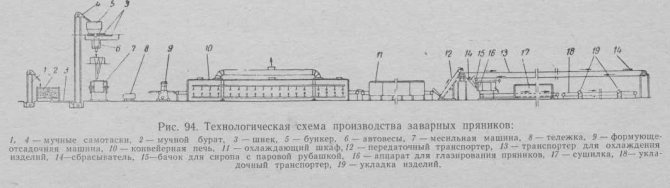 Тестовые заготовки выпекают в конвейерной печи 10. Пряники после выпечки предварительно охлаждаются в шкафу 11, а затем через передаточный транспортер 12 поступают на транспортер 13 для окончательного охлаждения. Охлажденные пряники загружают во вращающийся аппарат 16 для глазирования и поливают специально приготовленным сахарным сиропом из бачка 15. После этого пряники подсушивают в сушильном шкафу 17 и выстаивают до появления на поверхности выкристаллизовавшегося сахара, а затем укладывают в коробки или ящики.