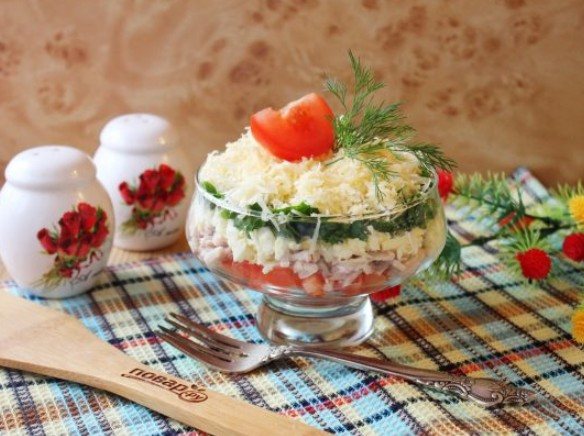 Пожалуй, это один из самых необычных слоеных салатов в представленной подборке рецептов. Легкая кислинка киви делает вкус весьма интересным, при этом подчеркивая остальные ингредиенты. Если вы хотите приятно удивить своих гостей, то обязательно выберите этот салат. К тому же у него очень удачное оформление. Салат нужно выкладывать на плоском блюде, поставив в середину стакан, чтобы получилось кольцо.