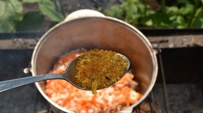 Залить зирвак кипятком, чтобы слегка прикрывал зирвак. Добавить соль, приправы и тушить на умеренном огне 25 минут, прикрыв казан. За это время вода выкипит. Закинуть нарезанный кубиками кабачок и положить крупу. Обычный классический пилав готовится с рисом, но бывают варианты приготовления и с другими крупами. Рис залить кипятком настолько, чтобы утопить на 1 см.