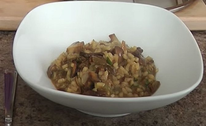 Приготовление этого блюда состоит из двух частей — сначала готовится грибное соте, затем рис. В конце все смешивается, настаивается 5 мин под крышкой. Кусочек сливочного масла и немного стружки Пармезана дополняют кремовую сливочную консистенцию.