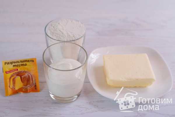 Сделайте паровую баню и поставьте на неё миску с маргарином или маслом, порезанным на кубики. Включите медленный огонь, введите в него сметану. Подогревайте еще в течение одной-двух минут, постоянно помешивая. Затем в глубокую посуду просейте муку, соедините ее с разрыхлителем для теста и сюда же вылейте полученную сметанную массу. Тщательно вымесите тесто, чтобы не осталось ни одного комочка. Оно должно быть эластичным и в меру плотным. Накройте массу пищевой плёнкой и уберите ее в холод примерно на полчаса.
