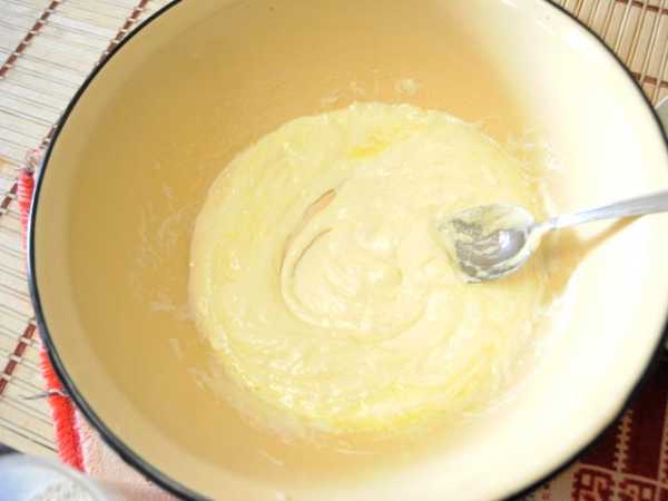 Теперь давайте уделим внимание приготовлению нежного крема. Обычно его делают со сметаной, но мы возьмем домашние сливки. Высыпьте в них сахарный песок, пару шепоток ванилина. Затем взбейте с помощью венчика куриные яйца, когда они приобретут однородность, подмешайте полученную смесь в крем. Чтобы он вышел не слишком жидким, добавьте природный загуститель — пшеничную муку. Если у вас есть миксер, советуем воспользоваться им для взбивания соуса. В таком случае масса выйдет более однородной.
