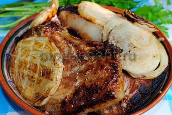 Обычно лук во время жарки мы убираем, так как он, как правило, при использовании шампуров плохо на них держится, свешивается вниз, подгорает. Но не в данном случае. Кольца, а вернее даже круги крупного лука мы положим на куски свиной корейки и он, во-первых, возьмет на себя некоторую защитную функцию – убережет мясо от пересыхания, а во-вторых, кружки лука, будучи толстыми и большими не обуглятся и в результате вы получите очень аппетитное дополнение к шашлыку.