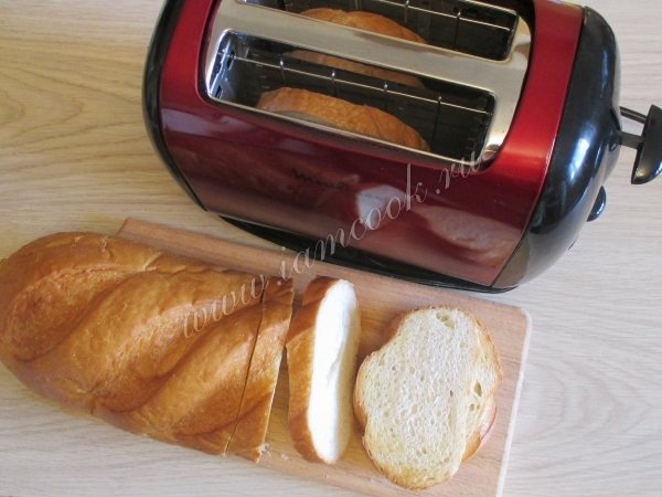 - Булочки режем вдоль на 2 части и поджарим в тостере.