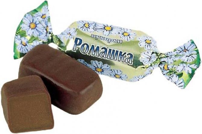 «Ромашка» — помадные конфеты с добавлением коньяка. укутанные в кондитерскую глазурь. Калорийность составляет 419 кКал, БЖУ в пропорции 2,7 г/13,6 г/74 г.