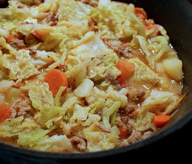 Этот вариант понравится тем, кто любит нежную структуру и интересный вкус блюд. Капустная солянка приобретает пикантную окраску из-за добавления томатной пасты. Этот простой ингредиент делает блюдо ярче.