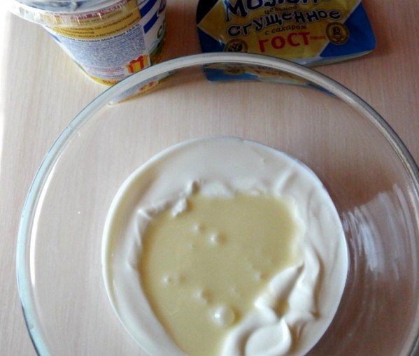 3. Теперь сделайте крем, соедините в миске сметану и сгущенное молоко и перемешайте.