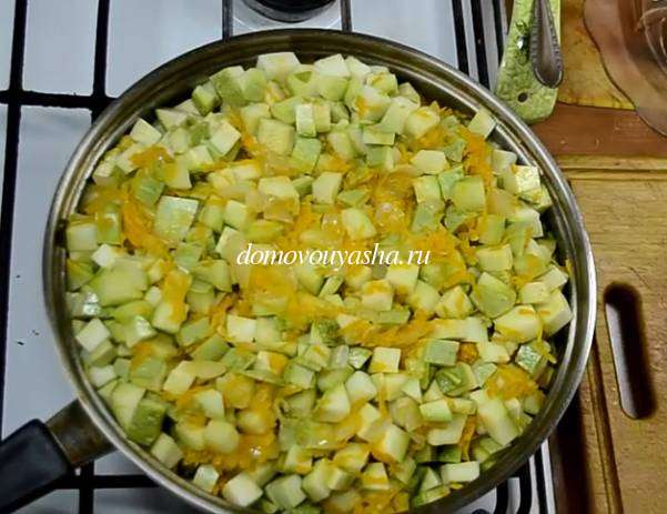 3. Нарезаем кабачки. 4. Обжариваем на растительном масле лук и морковь, до полупрозрачного состояния лука. 5. В сковороду, к обжаренным овощам добавляем нарезанные кабачки.