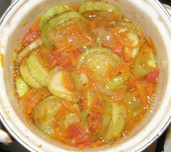 Кабачки, тушенные с морковью, луком, помидорами и сметаной