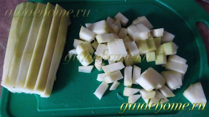 Нарезать овощи пластинками толщиной 0,5 см. Если для приготовления используются молодые плоды, кожицу снимать не нужно, со старых плодов ее желательно снять.