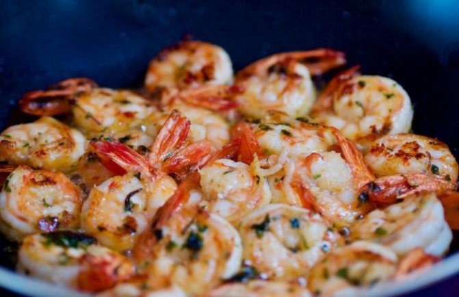 - Разморозьте королевские креветки. Обсушите их, обжарьте на сковородке